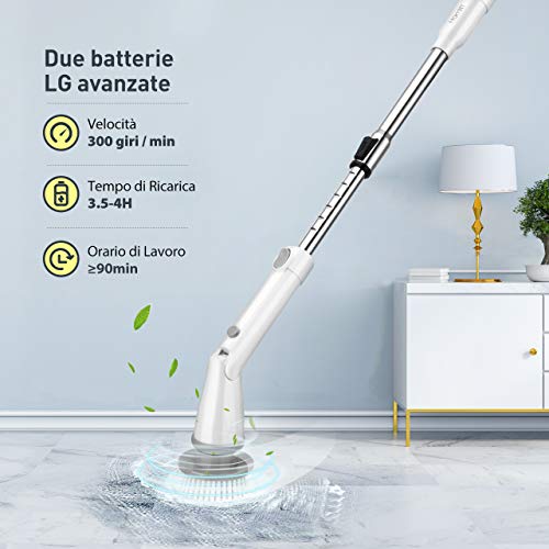 • [Batteria Ricaricabile Potente]: la nostra spin scrubber è alimentata da due batterie avanzate da 3.6 volt 2150 mAH. Il tempo di utilizzo sostenibile è superiore a 1 ora dopo solo 3-5 ore di ricarica.