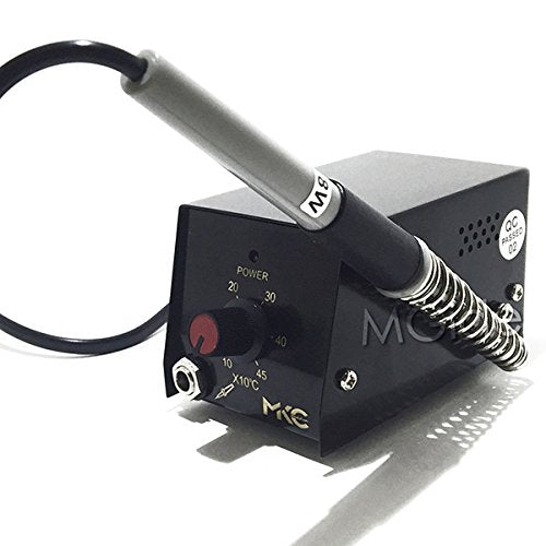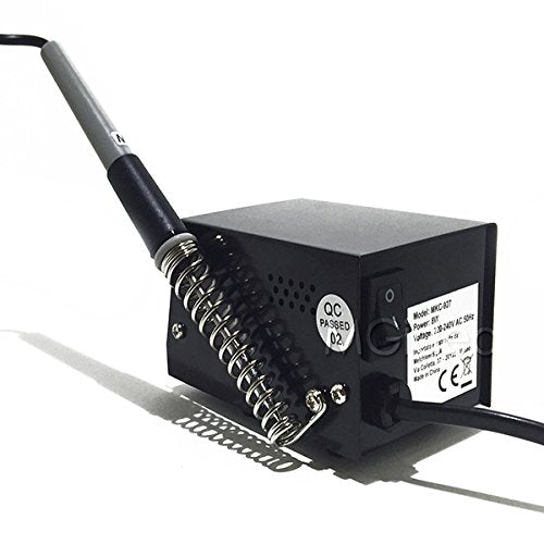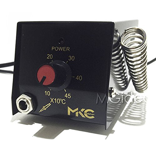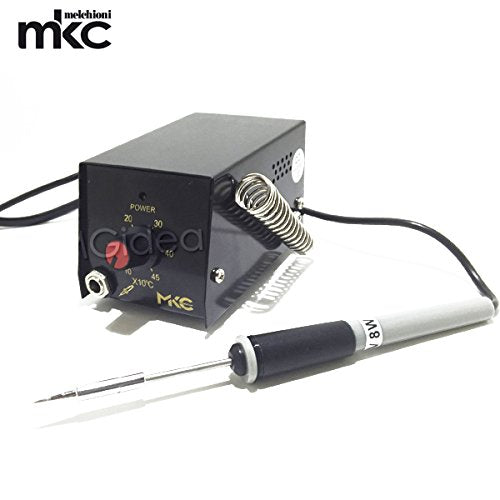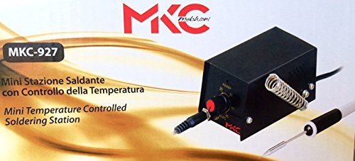 Mini stazione MKC-927. Dati tecnici: Tensione d'ingresso: 220-240 VAC Tensione saldatore: 12Vca Potenza assorbita: 8W Temperatura: 100° ~ 450°C Peso: 600g c.a. Dimensioni: 95P x 60L x 50H mm Punta di ricambio opzionale: Mini saldatore opzionale: Grazie al mini stilo è possibile saldare posti difficilmente raggiungibili da un normale saldatore. Saldare alla corretta temperatura è molto importante per garantire una saldatura perfetta. Se la temperatura è troppo bassa, la lega per saldare non fluisce correttamente e genera saldature "fredde". Se la temperature è troppo alta, il fondente verrà bruciato e non consentirà alla lega per saldare di scorrere. Alte temperature possono anche danneggiare circuiti stampati e componenti sensibili. La corretta impostazione della temperatura di lavoro della punta in base a parametri corretti, adatti alla particolare saldatura in questione, garantisce una saldatura ottimale.