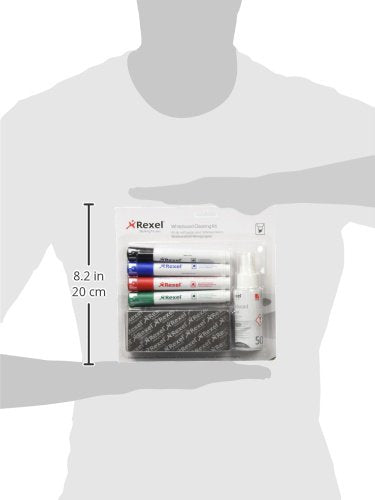 Il kit di pulizia per lavagne bianche Rexel consente di mantenere le lavagne in condizioni ottimali nelle sale riunioni, negli uffici, a casa e in classe. Contiene quattro pennarelli cancellabili a secco dall'odore discreto (nero, rosso, verde e blu), un cancellino in schiuma e uno spray per la pulizia.