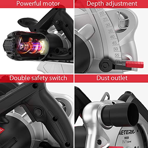 Sega Circolare, Meterk Sega Circolare (1500W 4700 RPM), Taglio 65mm (90º), 45mm (45º), 2 Dischi 24T+ 40T: 185*20*2mm,Guida Laser, Doppio Interruttore di Sicurezza per Legno, Metallo Sottile, Plastica