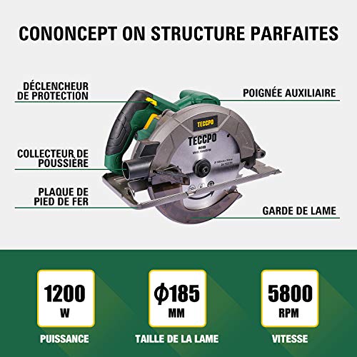 Sega Circolare, TECCPO Professionale 5800 RPM 1200W Sega Elettrica, con 24T lame 185mm, Profondità di taglio 63 mm (90 °), 45 mm (45 °), Protettore in Alluminio, Motore in Rame Puro - TACS22P