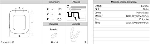 Questo sedile copriwater è prodotto al 100% in Italia. E' Realizzato in MDF poliesterato laccato. L'mdf è un derivato del legno ricavato dalla miscela di resine e fibre di legno vergine di prima scelta. Utilizziamo solo MDF prodotto in Italia e che viene sottoposto a rigorosi test in acqua e sotto pressa per testarne durata ed affidabilità. Le cerniere sono realizzate in ottone cromato a garanzia di resistenza alla corrosione, alla durata e affidabilità e sono prodotte in Italia. I paracolpi sono realizzati in materiale bicomponente che rende il prodotto compatto (non si sgretola). Questo sedile copriwater è stato realizzato per applicazione su vaso Dolomite Rio, GSI Div. Venus Master-Time, Hatria Spea Lotus, delta golf, Europa Doggi.