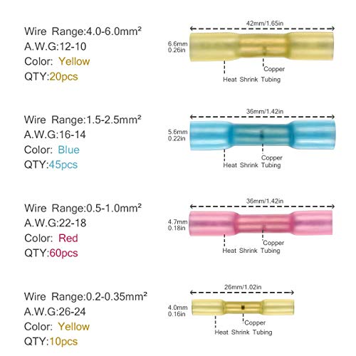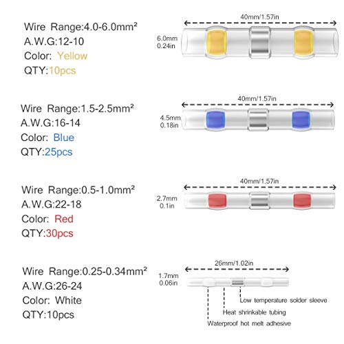 - * Cosa ottieni --- Connettori termorestringenti: 10 gialli, 60 rossi, 45 blu, 20 gialli; Connettori del filo per saldatura: 10 bianchi, 30 rossi, 25 blu, 10 gialli.