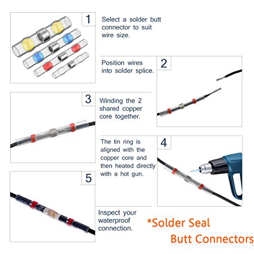 Taglia:210pcs Sopoby Solder Seal Wire Connectors & Heat Shrink Butt Crimp Connectors Electrical Connectors Waterproof Assorted Wire Terminal Kit ● Package Included: 1 × Pack of 210PCS Heat Shrink Connectors (75pcs Solder Seal Wire Connectors + 135pcs Heat Shrink Crimp Butt Connectors) HOW TO USE HEAT SHRINK CRIMP BUTT CONNECTORS? 1. Strip & Insert ①Select the terminal with right wire gauge for the wires; ②Strip 2 wires to about 8mm; ③Twist and insert into splice barrel in the middle 2. Crimp ①Crimp the middle side of the terminal; ②Crimping tool with gauge dots is better choice for this project. 3. Apply Heat Rotate the terminal while applying heat until it reduces in size and the adhesive flows, filling gaps within the connector; For better results, you'd better use a heat gun. 4. Seal & Done. Inspect your waterproof quality connection. Allow the terminal to cool down for use. HOW TO USE SOLDER SEAL WIRE CONNECTORS? 1.Strip & Insert Strip wire insulation 1/3 inch on both wire ends. Slip the connector into one of the wires. Twist the strands together. 2.Apply Heat Apply heat while continuously rotating the wire to make the connector evenly heated. For better results, you'd better use a heat gun. 3.Seal & Done The tubing will shrink down. Solder will melt and flow through the stripped wires. Allow the connector to cool down for use.