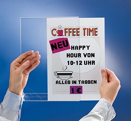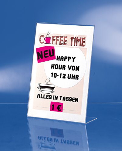 Taglia:für A4 Porta-menu da tavolo inclinato, per la presentazione su un lato ad esempio di campagne ed eventi, informazioni d'ampio interesse ed offerte, formato a4. per banconi, tavoli, spazi espositivi e fiere. Materiale acrilico d'alta qualità trasparente cristallo, con bordi lisci e levigati, spessore 1,7 mm. Dimensioni esterne: 300 x 210 x 63 mm (l x h x l).