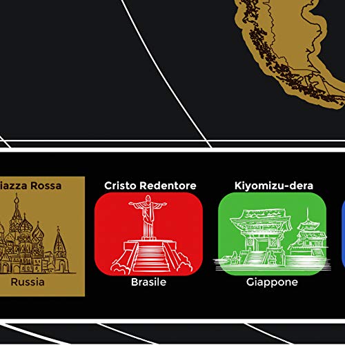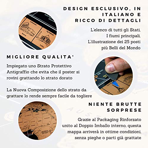 • MIGLIORAMENTI SPECIALI - Impiegata una speciale pellicola protettiva antigraffio che evita che la mappa si rovini grattandola, conservandone sempre un aspetto perfetto. Il packaging ad alto spessore e il doppio imballo interno la proteggono al 100% durante il trasporto e verrà recapitata senza pieghe o parti grattate. La stampa di precisione fa combaciare alla perfezione lo strato di base con quello da grattare. Usate le migliori carte e una nuova lamina d'oro che si toglie con facilità