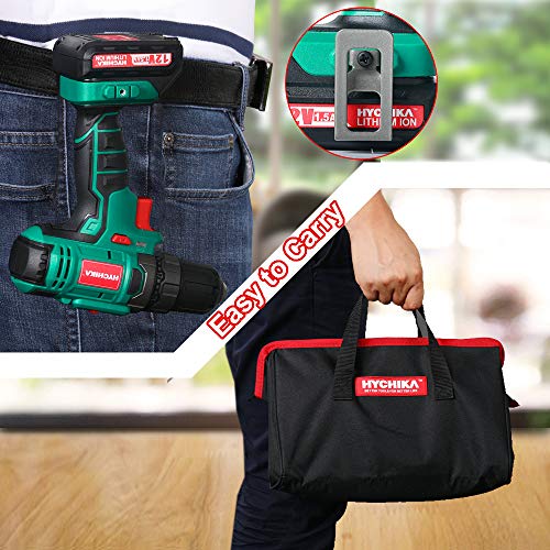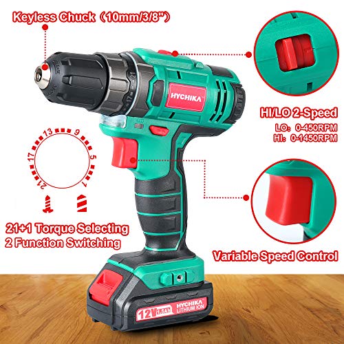 Trapano Avvitatore Batteria 12V, HYCHIKA Avvitatore a Batteria 30N .m Mas, 4x Punte Piatte, 6x Punte Elicoidali, 6x Pezzi di Viti, 5x Chiavi a Hussola e Custodia