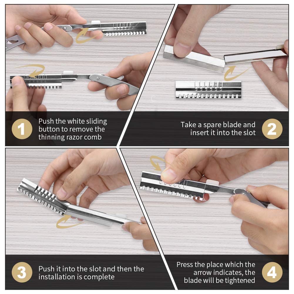 - Kit Completo - Set di forbici professionale che include una forbice da taglio liscia, una forbice per sfoltire dentellata, un rasoio sfilzino con pettine, 5 lame di ricambio, un pettine, sei anelli in gomma riduttori, un regolatore di tensione e un panno per la pulizia, il tutto contenuto in una elegante custodia in eco pelle, per ottenere in modo facile un taglio come dal parrucchiere
