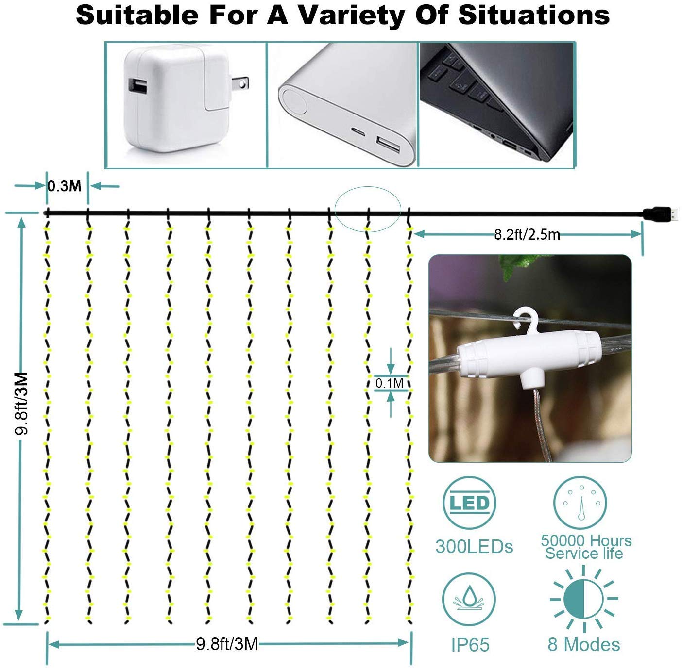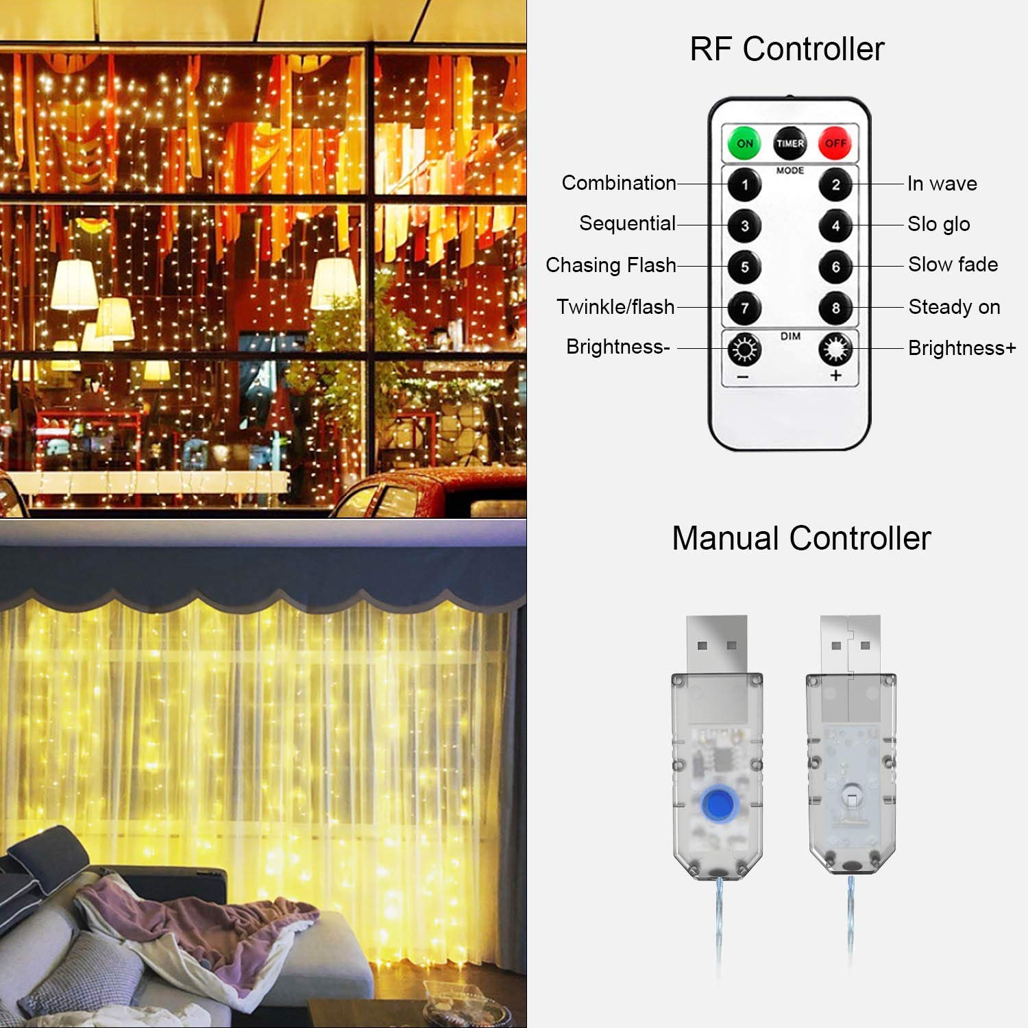 - 💕 Design speciale: Tenda led con telecomando wireless, impostabile Combinazione, onde, sequenza, Slo-glo, inseguimento / lampeggio, variazione graduale, luce lampeggiante / lampeggiante, luce fissa. 8 modalità di illuminazione, funzioni di temporizzazione, regolazione della luminosità.