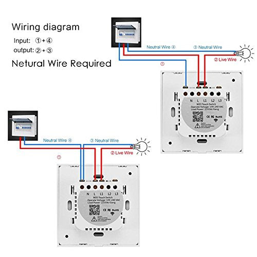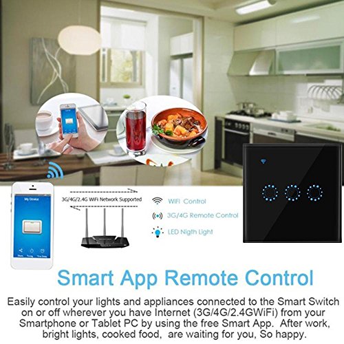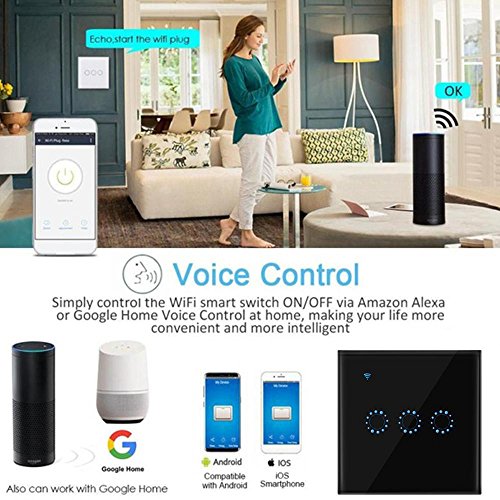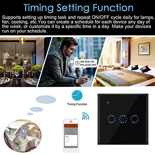 - Interruttore a parete Touch Smart Wi-Fi: questo interruttore tattile supporta la massima potenza di 2200 W che può funzionare con la maggior parte delle luci e altri apparecchi elettrici. Dimensioni: 3,4 (L) * 3,4 (W) * 1,4 (H) pollici, tensione CA 90-250V.