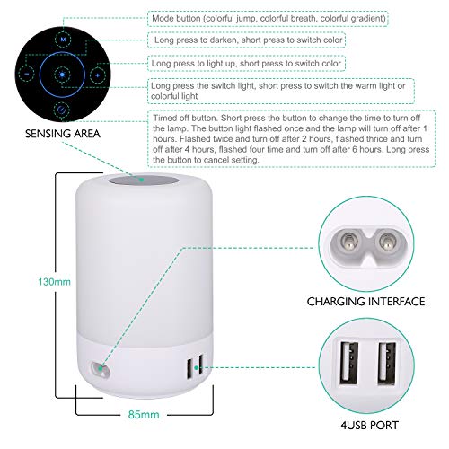 - PORTE USB CONVENIENTI: questa lampada da tavolo è dotata di 4 porte di ricarica USB da 5 V / 2,4 A. Il prodotto deve essere collegato all'alimentazione durante l'uso. Il prodotto non ha una batteria integrata.