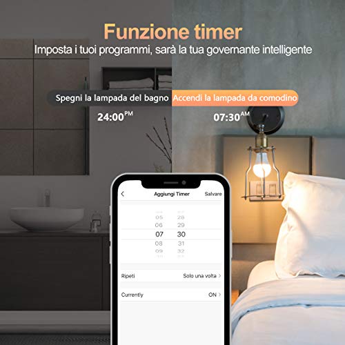 - 【Impostazioni programma】 - È possibile creare un programma personale, basta impostare il programma nell'APP "Smart Life", la lampadina può essere accesa o spenta automaticamente. La funzione timer consente di far funzionare la lampada come un allarme luminoso. Ti svegli o dormi in modo naturale e confortevole, goditi la vita che diventa più comoda.