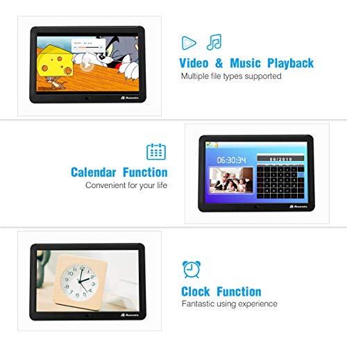 • 【 Funzioni mutevoli 】 Dotato di molteplici funzioni tra cui lettore MP3/foto/video, orologio e calendario, è più di una semplice cornice. La cornice fotografica digitale supporta unità USB, MMC, SD, MS, SDHC (fino a 32 G). Non richiede alcuna configurazione e nessun software da installare, facile da usare.