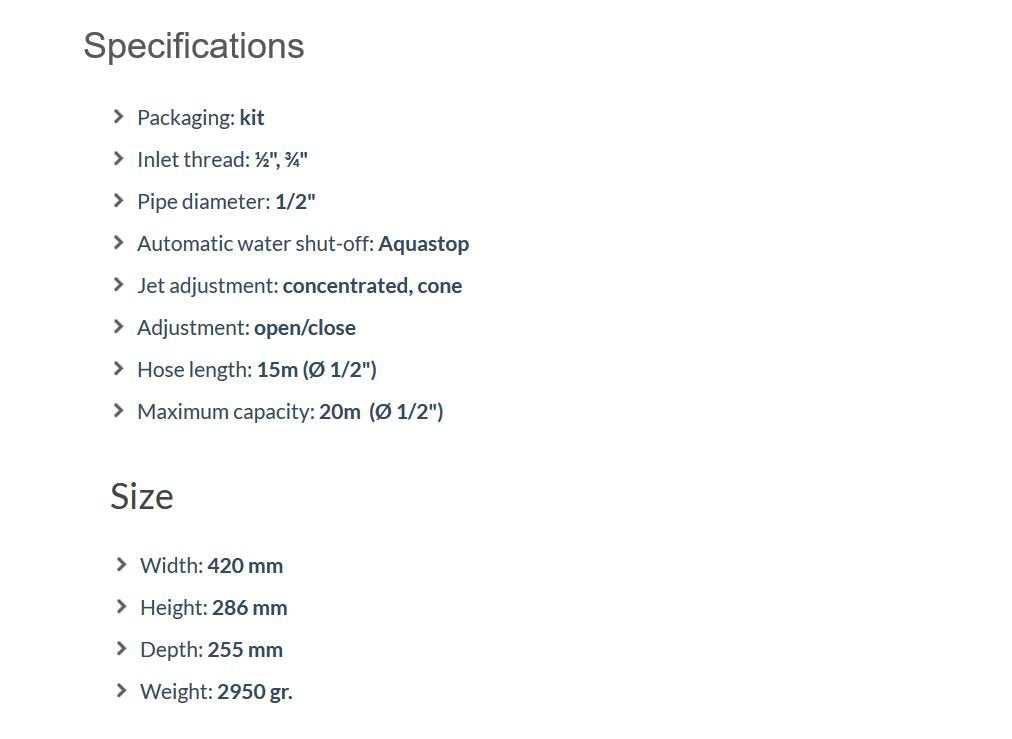 - Avvolgitubo da parete con: 15 mt di tubo da 12-17 mm, presa rubinetto 3/4 con riduzione 3/4-1/2, 4 raccordi automatici, lanciaspruzzo