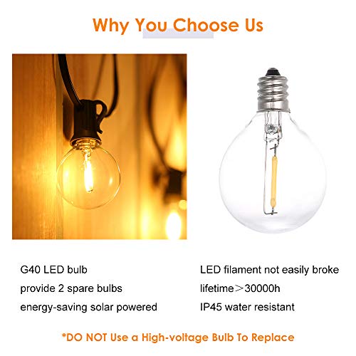 - 【Luci stringa G40 da 25 piedi】: 7,62 m / 25 piedi 25 luci stringa stringa E12 con 2 lampadine di ricambio, nessuna luce intermittente e lunga durata, basso consumo energetico e risparmio energetico.