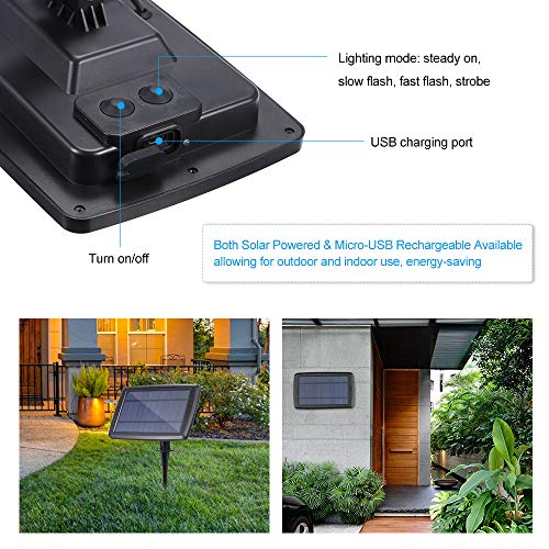 - 【Disponibilità di ricarica sia solare che micro-USB】: con pannello solare in polisilicio da 3W / 5,5 V e anche una porta di ricarica micro-USB, consente di illuminarsi nei giorni di pioggia. Può illuminare per 8-12 ore dopo completamente 8 ore di ricarica.