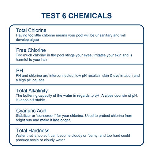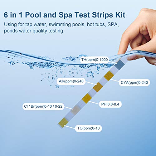 • Aggiornamento 6 in 1: strisce di prova a 6 vie per PH, cloro totale, cloro libero/bromo, alcalinità totale, acido cianurico e durezza totale.