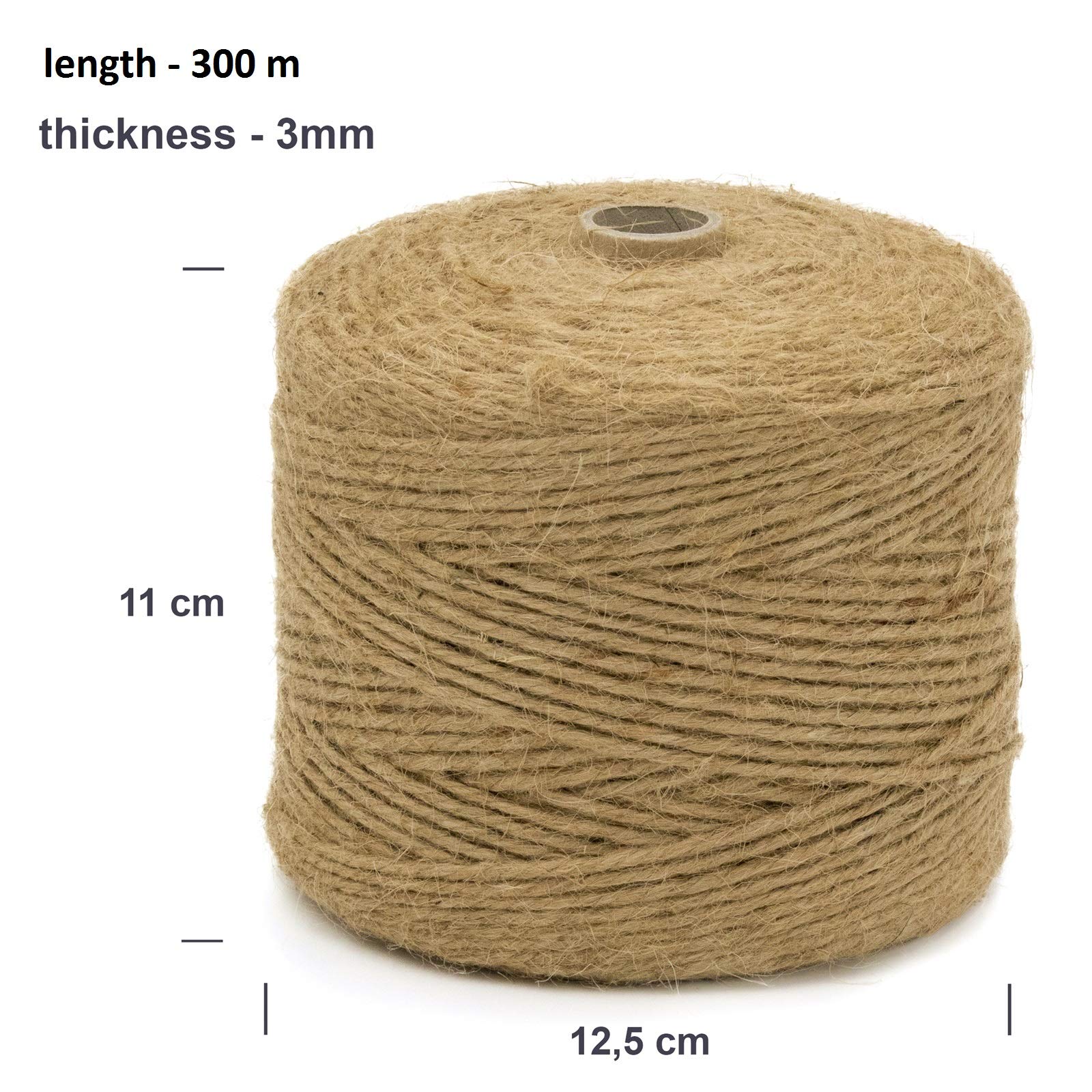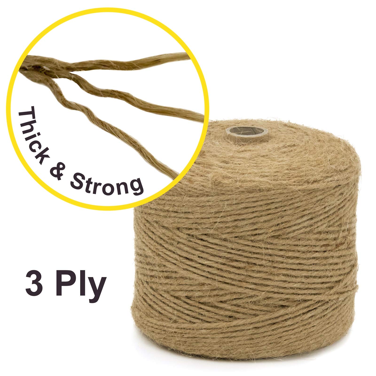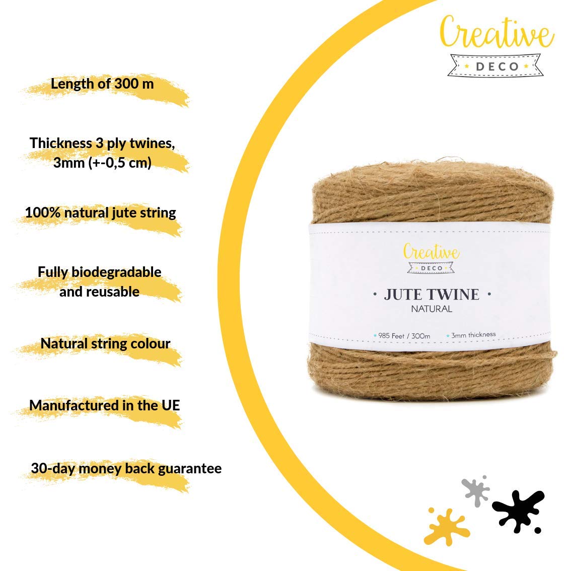 - GRANDE DIMENSIONE - Con 3 fili di piega e 985 piedi di lunghezza (300m) / 3 mm. Lo spago di iuta creativo è molto lungo e abbastanza spesso da conferire un'alta resistenza. È morbido ma molto più resistente delle corde ordinarie. Confezionato in una bobina, non si attorciglia e puoi tagliarlo a qualsiasi lunghezza.