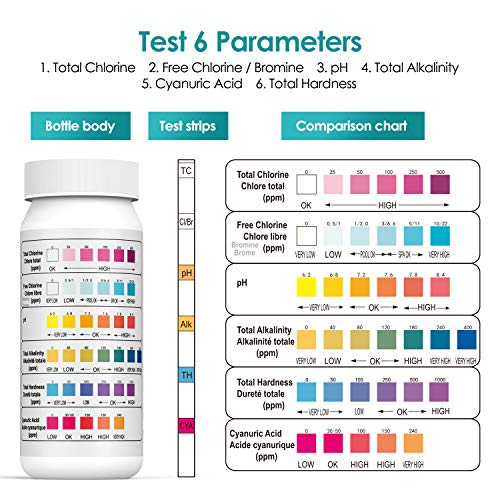 - 【Nuovo 6 in 1】: Ogni test piscina per Acqua striscia per test dell'acqua può misurare 6 parametri importanti: PH, alcalinità totale, cloro totale, cloro libero / bromo, acido cianurico, durezza totale.
