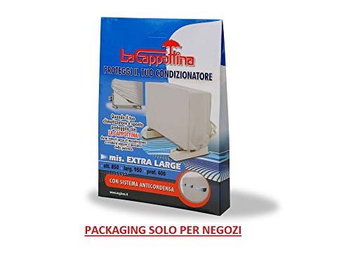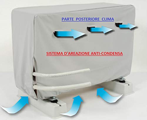 Taglia:EXTRA LARGEUnica del suo genere ad avere dei lacci su tutto il bordo inferiore della cappottina per evitare che il vento forte la faccia volare via.perche serve proteggere il clima?si deve impedire alla polvere di ostruire la batteria esterna quando il clima resta spento per diversi giorni. Questo provoca un calo di rendimento del condizionatore generando poco freddo all'interno della casa.caratteristiche: PVC 220,0 micron. Tessuto colore grigio resistente ai raggi uv. Interamente cucito e irrobustito nelle cuciture interne da una fetuccina. Fetuccina in stoffa per chiusura laterale “entrata tubi“. Cavetto grigio di chiusura in poliestere diametro 0,2 mm. Sistema d'aerazione anti condensa. PVC auto-estinguente. 100% made in italy.
