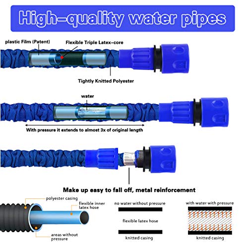 • 【Design Flessibile】Il tubo del tubo dell'acqua può essere espanso a 25FT (espandere tre volte la sua lunghezza originale). Quando il tubo dell'acqua è collegato all'acqua, il tubo della pressione dell'acqua si espande rapidamente fino a tre volte la sua lunghezza e recupera la sua lunghezza iniziale in pochi minuti quando l'acqua viene scaricata. Leggero, flessibile, abbastanza lungo, salvaspazio e comodo da trasportare.