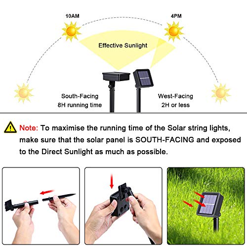 • 【ALIMENTATO AD ENERGIA SOLARE】: Questa luce a stringa solare può accendersi fino a 14 ore dopo 8 ore completamente cariche e otterrà la migliore carica se la metti in un'area aperta con luce solare diretta. Può essere ricaricato in una giornata nuvolosa, ma l'ora di illuminazione ne risentirà (Assicurarsi che la luce solare sia in modalità OFF e caricarla alla luce solare DIRETTA per 1 giorno in prima del primo utilizzo)