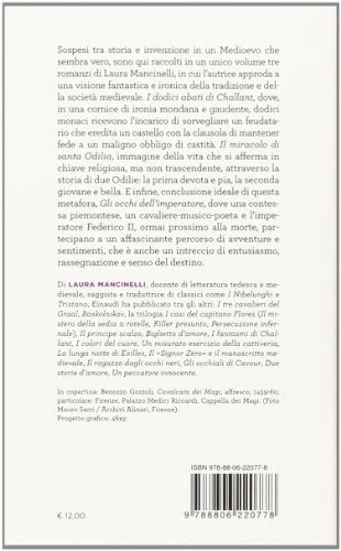 Sospesi tra storia e invenzione in un Medioevo che sembra vero, sono qui raccolti in un unico volume tre romanzi di Laura Mancinelli, in cui l'autrice approda a una visione fantastica e ironica della tradizione e della società medievale. "I dodici abati di Challant", dove, in una cornice di ironia mondana e gaudente, dodici monaci ricevono l'incarico di sorvegliare un feudatario che eredita un castello con la clausola di mantener fede a un maligno obbligo di castità. "Il miracolo di santa Odilia", immagine della vita che si afferma in chiave religiosa, ma non trascendente, attraverso la storia di due Odilie: la prima devota e pia, la seconda giovane e bella. E infine, conclusione ideale di questa metafora, "Gli occhi dell'imperatore", dove una contessa piemontese, un cavaliere-musico-poeta e l'imperatore Federico II, ormai prossimo alla morte, partecipano a un affascinante percorso di avventure e sentimenti, che è anche un intreccio di entusiasmo, rassegnazione e senso del destino.