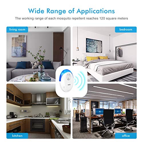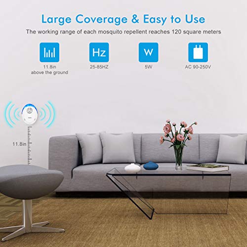 - Ampia copertura interna: 4 set di potenti combinazioni repellenti di repellente ultrasuoni zanzare possono sicuramente soddisfare le tue esigenze. Il raggio di azione di ogni repellente per zanzare raggiunge i 120 metri quadrati, in grado di proteggere in modo completo ed efficiente casa, casa, magazzino, giardini e uffici. Tuttavia, poiché l'effetto ultrasonico è indebolito da pareti e oggetti solidi, si consiglia di utilizzare un dispositivo per stanza.