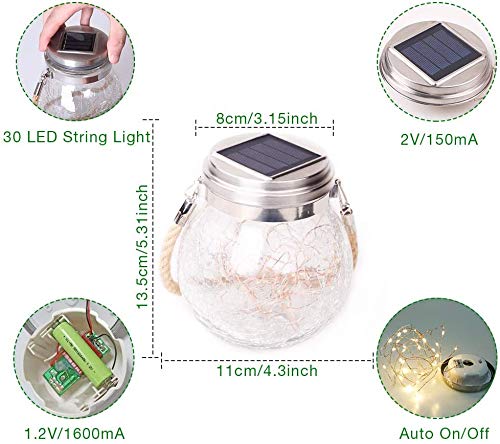 - Lanterne da Esterno da Giardino retrò: Questo nuovo tipo di lanterna solare per esterni con un sensore di luce integrato si carica automaticamente alla luce del giorno e si illumina al buio. È dotato di 30 microsfere a LED ad alta luminosità e una batteria agli ioni di litio da 1600 mAh ad alta efficienza, che è più luminosa dei prodotti comparabili nei mercati (si prega di aprire l'interruttore di alimentazione prima dell'uso)