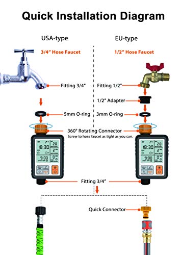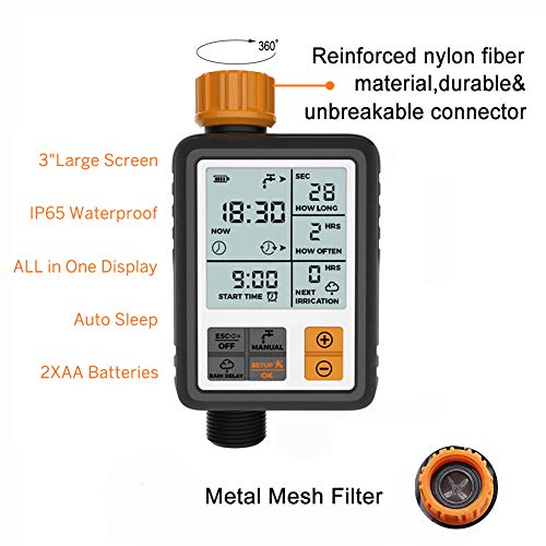 - Multi-Functione: La modalità manuale permette l’uso istantaneo dell’irrigazione senza interrompere il programma impostato di irrigazione. La modalità Ritarda Pioggia metterà in pausa il programma per un period per evitare di irrigare troppo e combattere gli sprechi. La modalità blocco bambini bloccherà lo spruzzatore durante i giochi dei bambini.