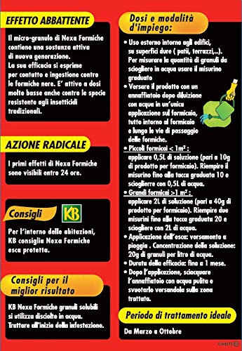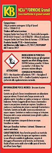 DescrizioneEsca antiformiche a base di fipronil in granuli solubili altamente attrattivi, che agiscono sia per ingestione che per contatto. Particolarmente efficace contro la specie lasius niger (formica nera dei giardini), elimina rapidamente le formiche adulte e le larve. Il prodotto viene portato dalle operaie nel nido e nel giro di breve tempo l'intero formicaio viene distrutto. Si applica sciolto in acqua direttamente sul formicaio. è particolarmente indicato in esterno, nelle aree circostanti all'abitazione. Dura fino a 1 mese. Dose: 20g di prodotto sciolto in 1 l di acqua. Piccoli formicai fino a 1mq utilizzare 0,5l di soluzione; grandi formicai a 1mq utilizzare 2l di soluzione. Usare i biocidi con precauzione. Prima dell'uso leggere l'etichetta e le informazioni sul prodotto. Fipronil 0,02% contiene amaricante prodotto biocida pt18 registrazione n. It/2017/00393/mrp.Avviso di sicurezzaUsare i biocidi con cautela. Prima dell'uso, leggere l'etichetta e le informazioni di prodotto.