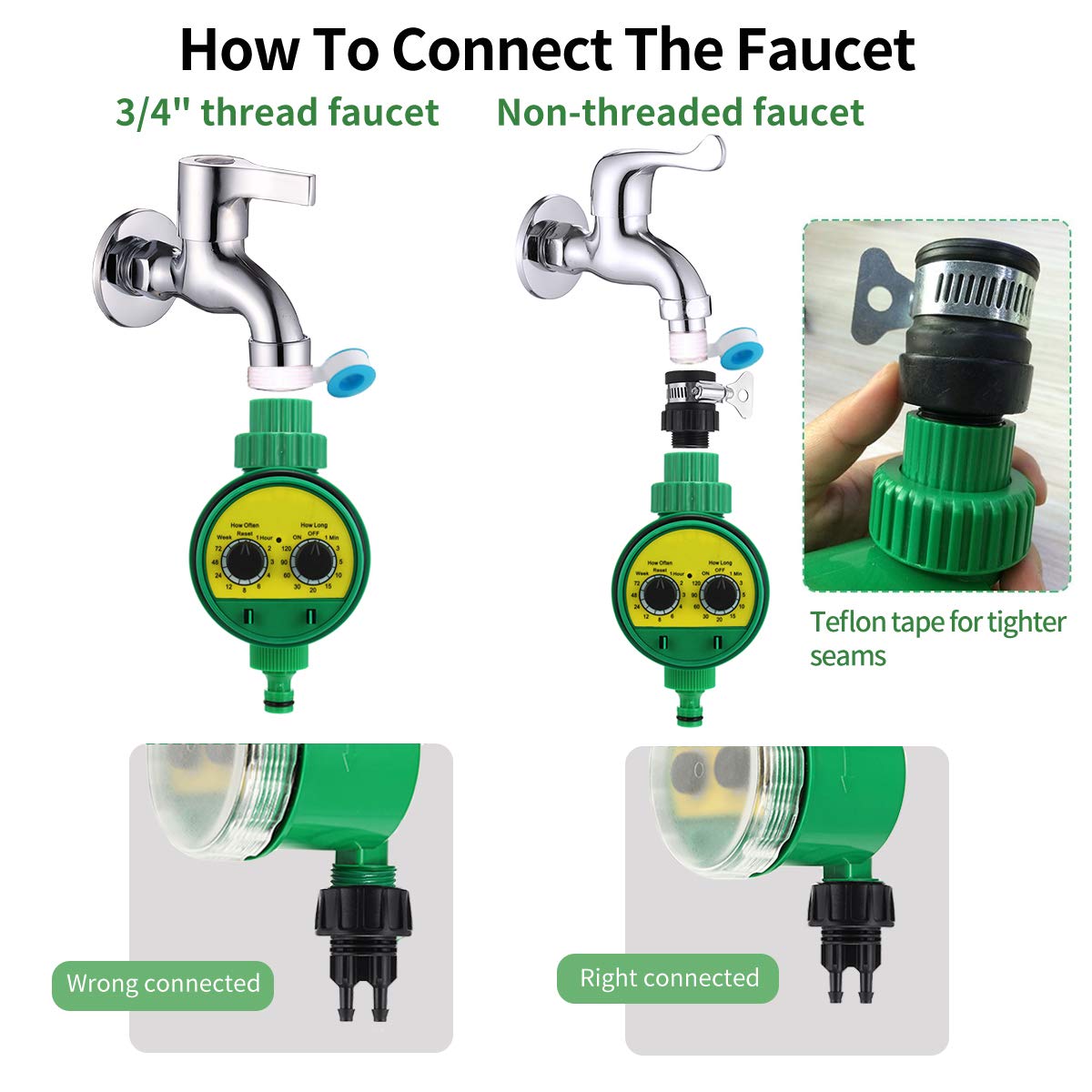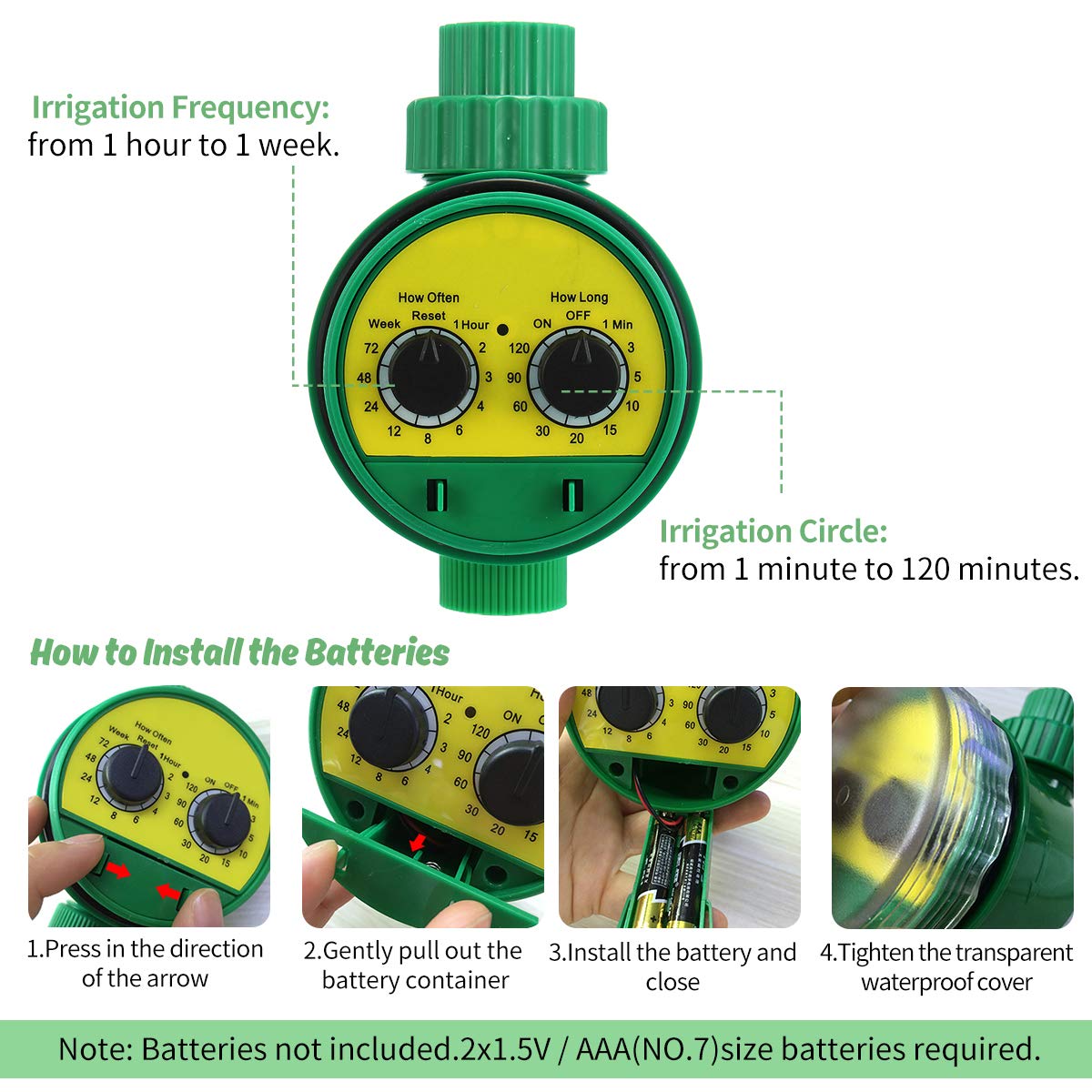 - 【Timer automatico:】dotato di un timer che può essere utilizzato per controllare la frequenza di irrigazione e cerchio di irrigazioneruotando il pulsante per garantire un'irrigazione efficace.
