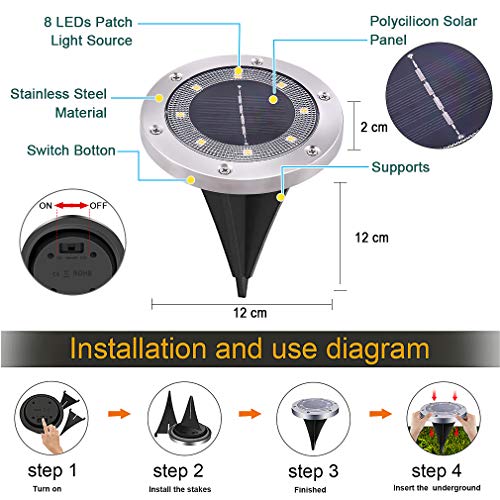 • 【Luci Solari Giardino 8LED】Piantate in giardino fanno veramente un bell'effetto luminoso regalando una magica atmosfera.A differenza degli altri modelli queste hanno ben 8Led, quindi la luce è più forte di quelle normalmente reperibili in commercio. La ghiera in metallo lucido e il corpo resistente conferiscono a questo faretto solidità e robustezza, rendendolo calpestabile. Un giardino ben illuminato vi assicurerà inoltre di tenere lontano i ladri dalla vostra casa.