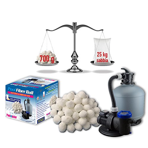 DescrizionePool Fiber Ball è la nuova generazione di materiale filtrante per piscine, sostituto ideale della sabbia impiegata tradizionalmente. Una confezione da 700g equivale, come capacità filtrante, ad un sacco di sabbia da 25 kg. Fiber Ball è realizzato in polietilene. Il mix di fibre garantisce, oltre ad ingombro e peso minimi, un livello di micro filtrazione delle particelle eccellente. Diversamente dalla sabbia non si aggrega ne' indurisce durante l'utilizzo. Facile da maneggiare grazie al peso ridotto. Non deteriora ne' danneggia le guarnizioni. Resiste ai prodotti chimici per piscina. Durata nel tempo garantita. Lavabile in lavatrice.Contenuto della confezione700g media filtrante