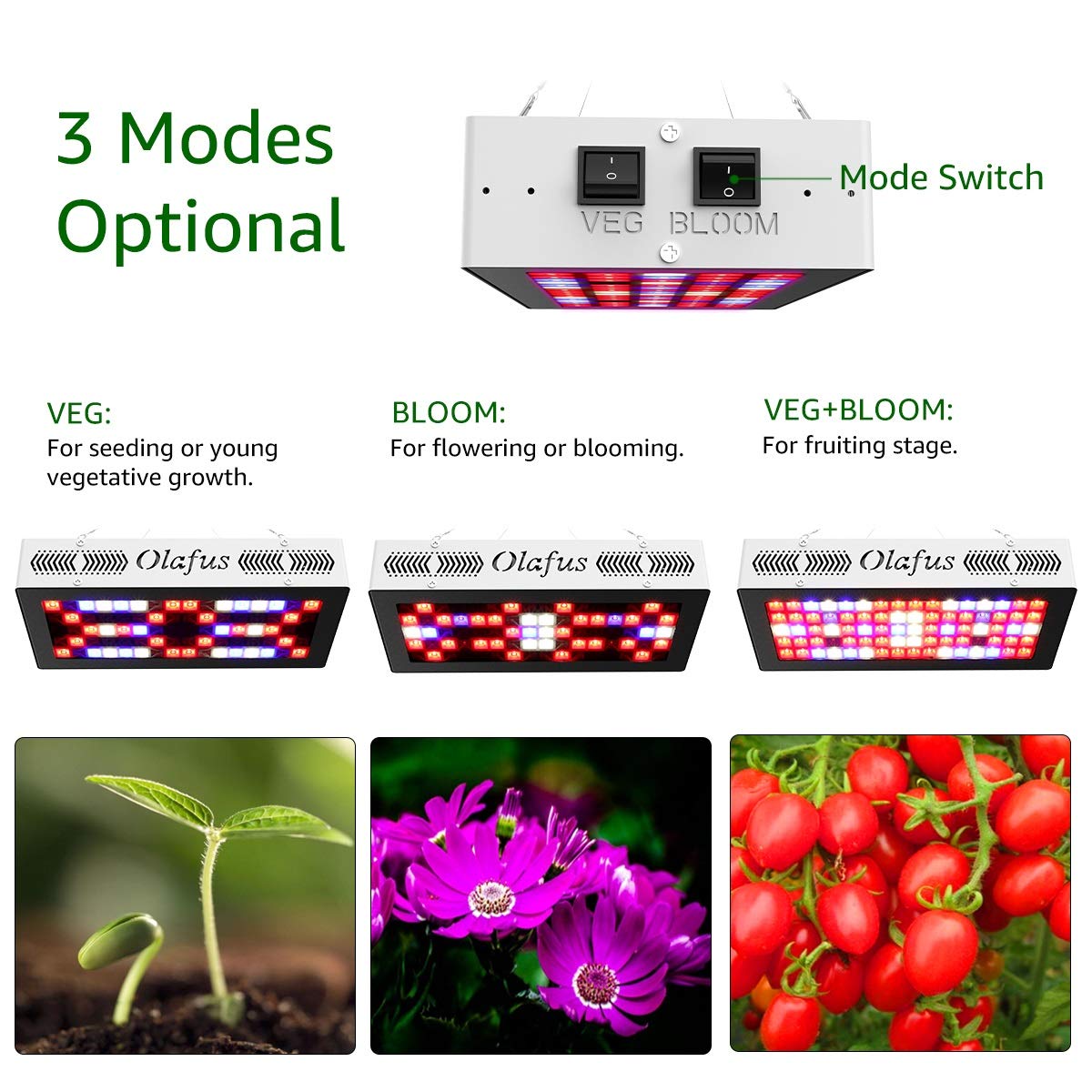 - 🌻VEG & Bloom - Lampada per piante può essere regolata. 2 interruttori 3 modalità. VEG sono progettati per la semina, per indurre le piante a crescere compatte, Bloom è progettato per la fioritura. VEG+Bloom per accelerare le piante risultare.