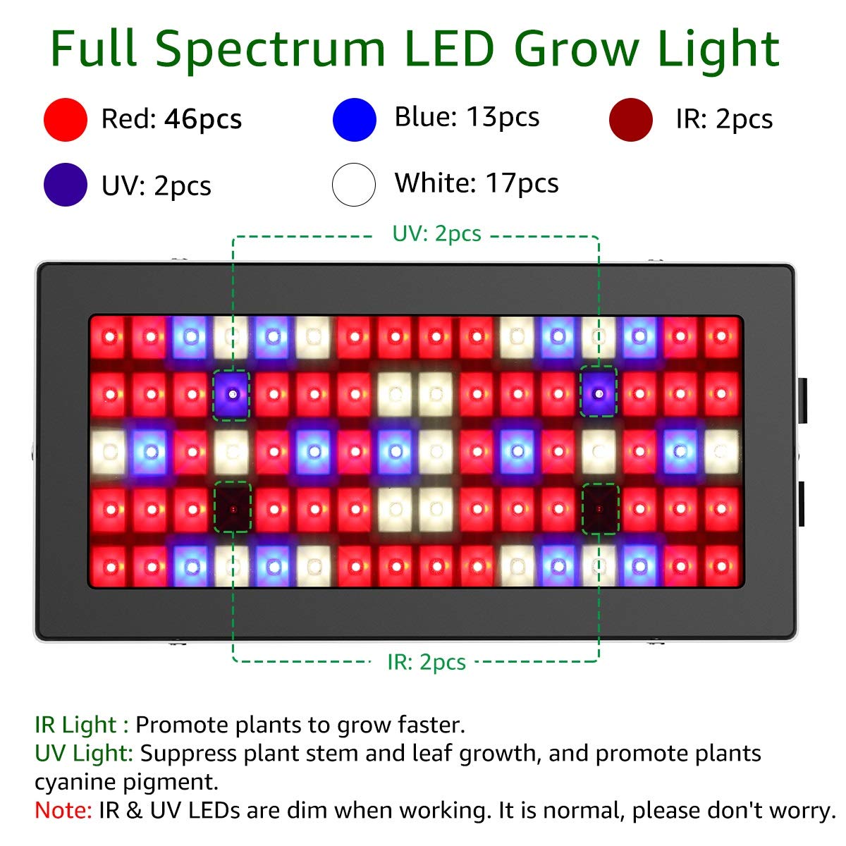 - 🌵Spettro Completo di Luci - Lampada per piante contiene 46 LED rossi, 13 LED blu, 2 IR 2 UV e 17 LED bianco, spettro completo di 12 bande da 400 a 745 nm, per la crescita e la fioritura delle piante per fornire tutto sotto il sole naturale, aggiungere abbastanza sostanze nutritive.