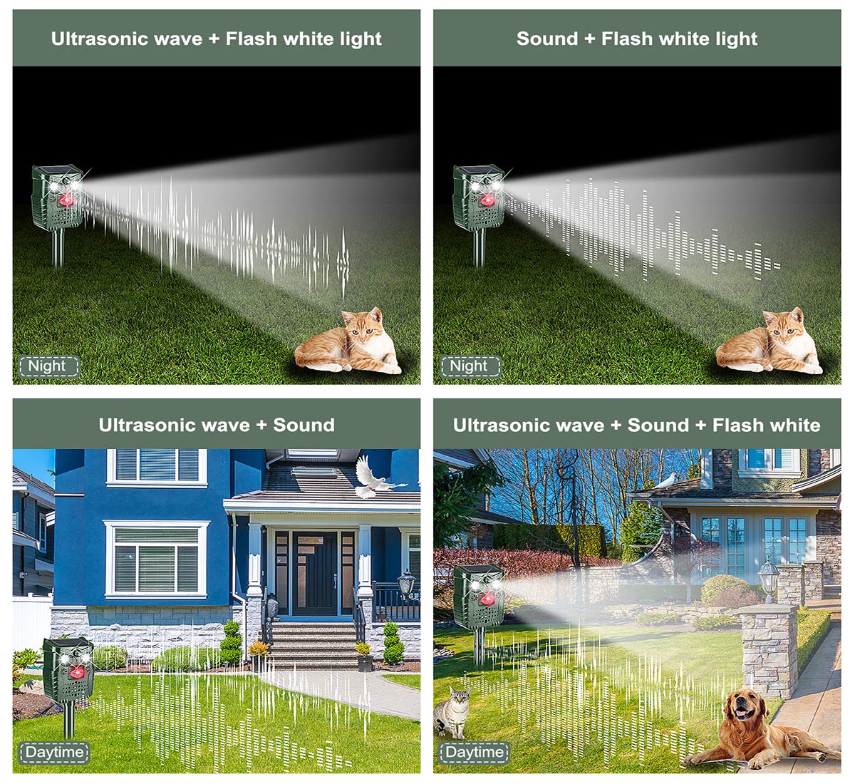 - 【Umano e rispettoso dell'ambiente】 - L'audio ad ultrasuoni ad alta sensibilità incorporato, il rilevatore a infrarossi e il flash LED, quando l'animale entra nell'area del rilevatore a infrarossi, attiva l'ecografia del gatto per emettere un'ecografia di frequenza variabile, che consente all'animale di fuggire dall'area. 4 diverse frequenze con maggiore sensibilità. Utilizza anche suoni e potenti flash per guidare gli animali.