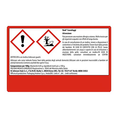 Descrizione prodottoEsca insetticida che attira ed elimina gli scarafaggi, pratica, non sporca ed è inodore, rimane attiva per 3 mesi, un sistema ad azione continua attivo 24 ore su 24. Funzionacontro ogni tipo di scarafaggio e contro i pesciolini d’argento. E’ indicato per eliminare gli scarafaggi da abitazioni, cantine, garage, bar, mense, ospedali e tutti i luoghi infestati. Funziona anche all’esterno per proteggere balconi, terrazzi e patii. Confezione da 6 pezzi. Separare le esche e collocarle dovesi annidano gli scarafaggi: in cucina sotto mobili e lavelliIngredientiComposizione per 100g: Abamectin 0,05 g Ingredienti inerti q.b. a 100 gInformazioni legaliPRODOTTO DI STRAORDINARIA EFFICACIAVisualizza di più