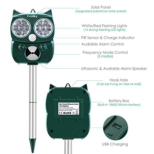 • 【Carica USB ed energia solare】 C'è un pannello solare sulla testa del gufo. Lascia che il gufo assorba l'energia quando c'è il sole. Inoltre, è dotato di una batteria al litio ricaricabile da 2000 mAh! È inoltre possibile caricare il repellente ad ultrasuoni tramite alimentazione USB. 5 MODALITÀ REGOLABILI La frequenza irregolare e variabile rende più efficace scacciare gli animali più aggressivi che possono adattarsi e diventare immune da una particolare banda di frequenza.