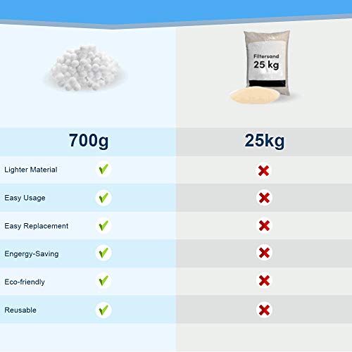 - 【Risparmio energetico】 A causa della maggiore capacità di filtrazione, il materiale filtrante richiesto è notevolmente ridotto, in modo che 700 g di sfere filtranti siano sufficienti per sostituire 25 kg di sabbia di quarzo filtrata.