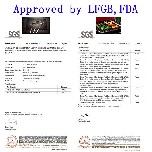 - OMOLOGAZIONE LFGB & FDA: I nostri tappetini per barbecue sono realizzati al 100% con materiali senza PFOA e con rivestimento in PTFE-fibra di vetro di alta qualità, senza PFOA, silicone o altri prodotti chimici pericolosi! Certificato come sicuro dalla FDA e LFGB approvato.