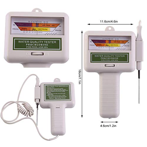 Materiale: Plastica + MetalloDimensione: circa. 7.1 "x 4.6" x 1.2 "Alimentazione elettrica: 1 batterie AA da 1,5 V (non incluse)Peso del pacco: 220gIstruzioni:1. Misurazione del PH (senza batteria):Misura del valore neutro / valore di acidità / valore alcalino:Innanzitutto, ruota la manopola verso PH fino a quando non scatta.Pulire delicatamente l'asta di metallo con carta vetrata fine per decalcificare, sciacquare l'asta di prova con acqua pura, quindi asciugare con un tovagliolo di carta pulito o un panno, ecc. Per 3-5 secondi per eliminare l'elettricità statica e iniziare la misurazione.(1) Inserire l'asta di prova nella soluzione neutra in posizione nera.(2) Il puntatore si sposterà lentamente e la lettura verrà presa dopo che il puntatore smette di oscillare (circa 3-5 minuti).2. Misurazione del valore del cloro (è necessario installare la batteria):1. Trova il punto di regolazioneA. Installare una batteria alcalina "AA" da 1,5 V.B. Ruotare la manopola verso CL fino a quando non può più essere spostata.C. Inserire l'asta di metallo trasparente nell'acqua nella posizione nera (l'acqua deve essere una soluzione standard con valore CL di 1,5 ppm)D. Mescolare delicatamente l'acqua con un'asta di metallo, quindi regolare lentamente la manopola verso destra fino a quando il puntatore punta a un valore CL standard noto.E. Estrarre l'asta di prova dall'acqua. Fare attenzione a non spostare la manopola. Il puntatore si sposterà a destra e si fermerà con una lettera tra A ed E. Questa lettera è il punto di regolazione.2. Misura:A. Regolare il puntatore sulla posizione "punto di regolazione".B. Inserire l'asta di metallo pulito nell'acqua in posizione nera. Il puntatore si sposterà lentamente e attenderà che la lancetta smetta di leggere prima di prendere una lettura (circa 3-5 minuti).