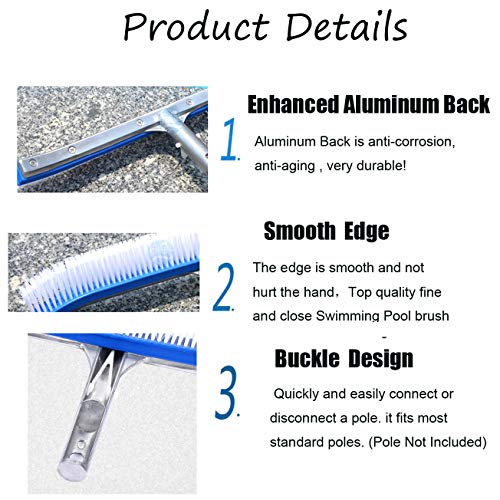 ★★★Benvenuto su VABNEER★★★ Dettagli del prodotto ➤ Condizione: nuovo di zecca ➤ Materiale: plastica ➤ Colore: come l'immagine mostra ➤ Dimensioni: circa 18 pollici ➤ Peso: 300g Scegli noi ☛ Spazzola per piscina robusta e funzionale progettata per pulire pareti, pavimenti, gradini e angoli, rendendo la pulizia della piscina un gioco da ragazzi. ☛Il manico in alluminio è leggero e strettamente connesso alla plastica blu. La maniglia in alluminio è inclinata di 45 ° per presentare la spazzola in una posizione ideale per una facile spinta e una pulizia efficace. ☛ Il robusto schienale in alluminio rinforzato, la struttura in plastica temprata, le robuste setole in poli, non si piegano o si rompono né danneggiano la piscina. ☛ Spazzola da muro e pavimento da 18 pollici con bordi arrotondati per facilitare ogni angolo.