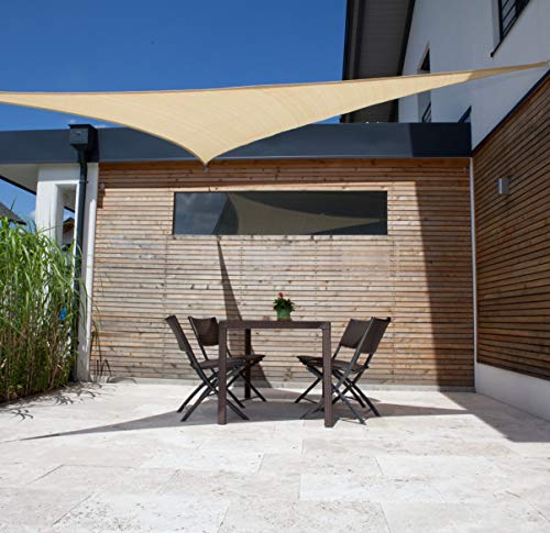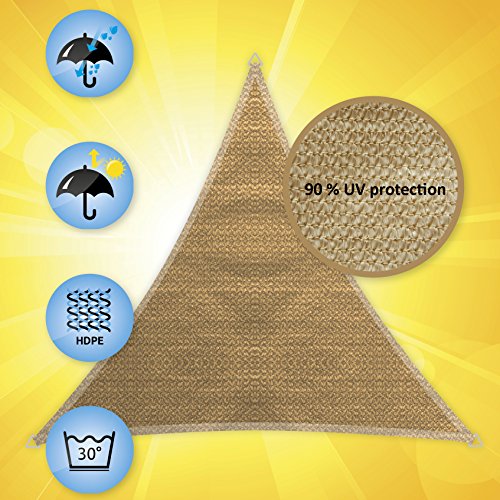 Tenda a vela triangolare resistente a strappi e agenti atmosferici. La tenda può essere fissata grazie a 3 funi di fissaggio da 1,5 m ciascuna. Grazie alla tenda avrai una protezione dai raggi UV fino al 90%. Il materiale con cui è fatta lascia traspirare aria e acqua non creando condensa. Lavabile a 30 °C.