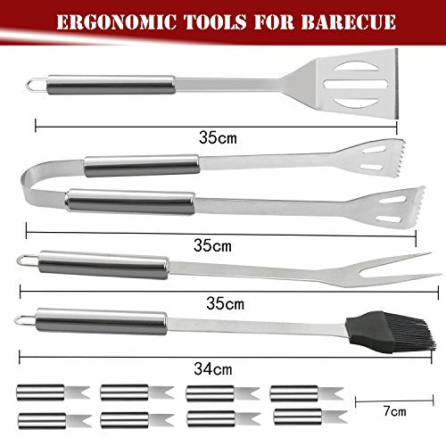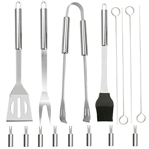 - Set di utensili per griglia per barbecue professionale: 20 pezzi Set di utensili per griglia per barbecue estivo in acciaio inox Include 1 spazzola per imbastitura (13,7 "), 8 supporti per mais, 7 per barbecue in acciaio inox (13,7"), 1 forchetta per barbecue jumbo (13,7 "), 1 barbecue clip (13,7 "), 1 spatola con apribottiglie incorporato (13,7"), 1 testina sostituibile. Tutti gli utensili sono lavabili in lavastoviglie.