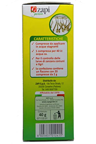 ZAPI - COMPRESSE ANTILARVALI Insetticida in compresse a rilascio immediato Zapi Zanzare compresse antilarvali da 2g a rilascio immediato. E' un prodotto biocida, indicato per il controllo delle larve di zanzare nei luoghi di riproduzione, attivo per 2-3 settimane. Punti di forza: Prodotto Biocida Efficace per 2-3 settimane Compresse da applicare in acque stagnanti Per il controllo delle larve di zanzare Per uso professionale Formulazione: 20 compresse a rilascio immediato da 2 g cad. Campo d’impiego: tombini, pozze d’acqua, vasi di fiori recisi, sottovasi, copertoni, fontane e piccoli specchi d’acqua, fossi, canali, stagni, vasche di depurazione sia in zone urbane che agricole. Lotta contro: larve di ogni specie di zanzara (tigre e comune). Modalità d’uso: 1 compressa per 40 litri di acqua in caso di acque molto inquinate/organiche (es. tombini). Ripetere i trattamenti ogni 2-3 settimane nel periodo primaverile-estivo, in corrispondenza della riproduzione delle zanzare. Registrazione Proxilar Compresse Biocida PT18 Autorizzazione n. IT/2018/00486/AUT DI LIBERA VENDITA - SDS: SI Periodo di utilizzo: Mag Giu Lug Ago Set Ott Nov Confezioni disponibili: flacone in astuccio40gr20 compresse