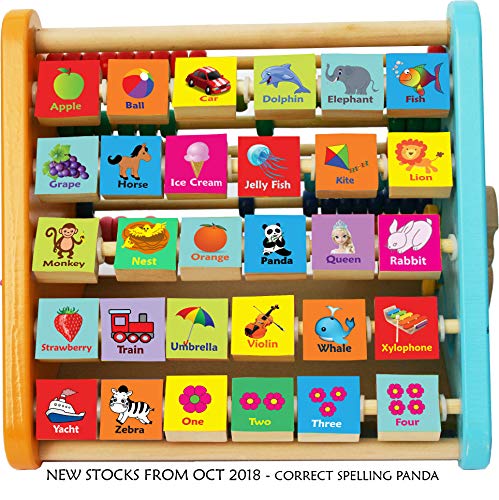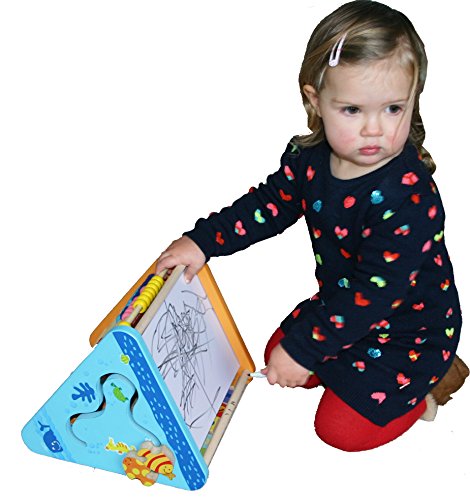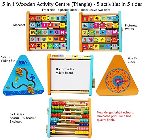 - Triangolo piramide multifunzionale con 5 attività in 1. Sui quattro pannelli ai lati trovate 26 blocchi dell’alfabeto girevoli e quattro blocchi con numeri, immagini e parole in Inglese, abaco, orologio, sagoma a forma di pesce scorrevole che si muove a zig-zag e una lavagnetta bianca sulla base. Uno dei migliori giochi in legno per bebè.