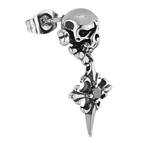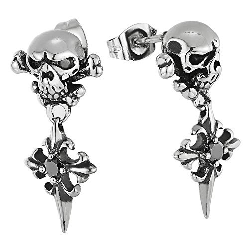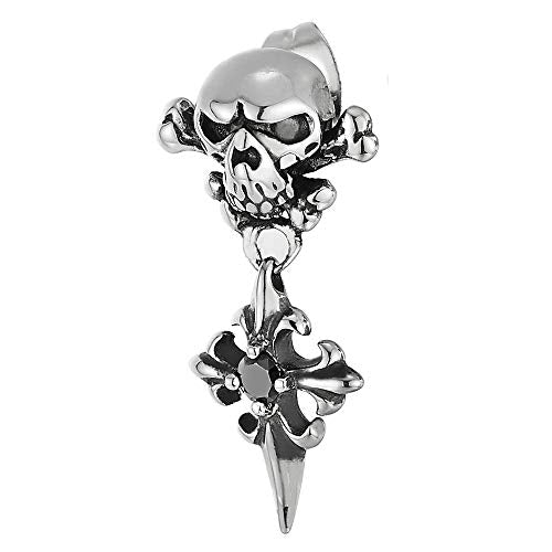 Annata Pirata Teschio Orecchini del Cranio con Pendenti Spillo Croce e Nero Zirconi, Uomo, Acciaio Inossidabile, 2 Pezzi