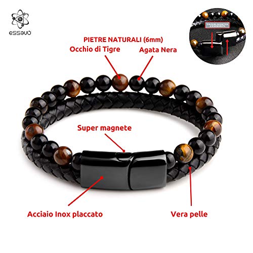 - QUALITA' - I bracciali ess3vu' sono realizzati con materiali di prima qualità, treccia in Vera Pelle e Pietre Naturali Occhio di Tigre, chiusura magnetica potenziata per evitare sganciamenti accidentali realizzata in Acciaio Inox placcato lucido. Fornito insieme ad una simpatica scatolina regalo.