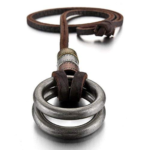 Mendino Ciondolo da uomo a doppio cerchio in lega d'argento con collana in vera pelle regolabile, 16 ~ 66 cm.